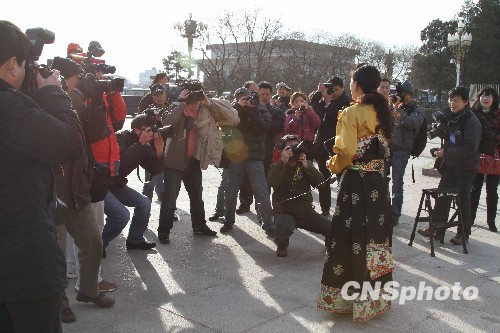 3月5日,十一届全国人大三次会议在北京人民大会堂开幕。西藏媒体在采访的同时,也成为了其他媒体关注的焦点。中新社发 韩苏原 摄