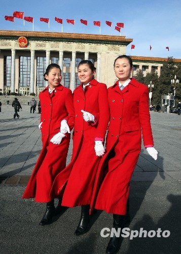 3月5日,十一届全国人大三次会议在北京人民大会堂开幕。美丽的礼仪小姐红装迎两会成为广场上一道靓丽风景。中新社发 汤彦俊 摄