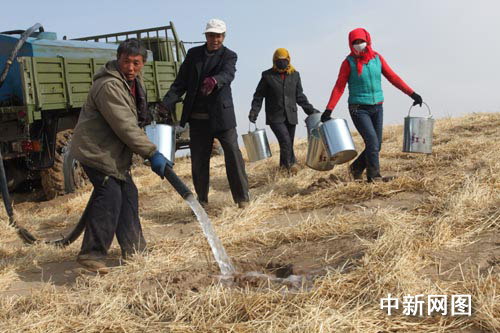 3月5日,甘肃省民勤县治沙工人正在向去年秋冬季压沙的方格内种梭梭等沙生植物。甘肃民勤县总土地面积2385万亩,其中各类荒漠化土地面积2254万亩,占94.5%,绿洲边缘风沙线长达408公里,是甘肃省乃至全国荒漠化面积较大、危害最严重的县份之一。经过多年的治理,截至目前,民勤县累计完成人工造林保存面积201.82万亩,封育天然沙生植被290万亩,封育成林76万亩,累计完成工程压沙25.08万亩,在408公里的风沙线上建成长达300多公里的防护林带,森林覆盖率由上世纪五十年代初的3.4%提高到现在的11.21%。
