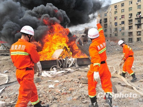 3月11日下午,湖北襄樊市工商、质监、财政、治安、消防等五部门,在沿江大道汉江明珠城施工现场联合举行假冒伪劣消防产品公开销毁仪式,对1780余件假冒伪劣灭火器、消防水带、应急照明、防火门、防火涂料等30多个品种不合格消防产品进行了集中销毁。中新社发 张虎成 摄