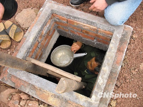 位于金沙江、岷江、长江三江交汇的四川宜宾县,目前正经受“冬干”连“春旱”的旱情而难解“口渴”。在该县灾情较为严重的横江镇油房村,当地村民修建的水窖虽然不能解决作物灌溉等问题,但基本能解决人畜用水。图为58岁的任美宽老人近日在水窖里艰难取水。中新社发 阳明 摄