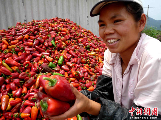 4月12日,几场透雨过后,重旱区——广西百色市平果县太平镇新圩村的村民们争先恐后下地抢收成熟的菜椒,尽快上市出售。如今在旱区,每公斤菜椒可卖得6元钱,是春节期间的三倍。中新社发 罗郅肯 摄