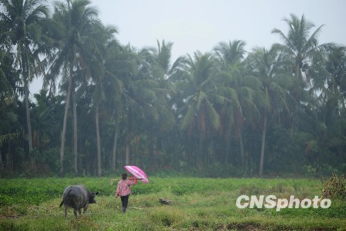 4月16日,海南琼海万泉镇的村民冒着小雨在田间忙碌。受冷空气影响,从15日下午开始,海南部分地区下起阵阵小雨,气象部门不失时机在有条件的市县进行火箭增雨作业,琼海市下起绵绵细雨。雨量虽不大,但对今年以来基本无有效降雨的琼海是难得的甘霖。当地村民纷纷行动起来积极投入耕种补种。中新社发 蒙钟德 摄