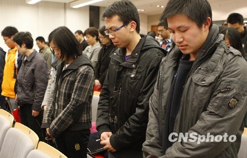 4月22日,前来参加《可爱的中国》报告会的清华学子向青海玉树地震遇难同胞志哀。当日,中国著名艺术大家遥远先生在北京清华大学报告厅作《可爱的中国》主题报告会,讲述中华正气、民族英雄的英雄事迹,推动高校爱国主义教育。中新社发 钱兴强 摄