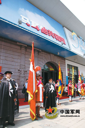 5月11日,上海世博会马耳他馆门前,身着古装的马耳他表演者为游客表演古代战争结束将士凯旋的场景。高吉全 摄