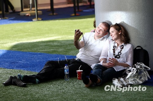 5月12日,一对在上海世博园玩累了的情侣在荷兰馆外席地而坐,享受美好的一天。中新社发 杜洋 摄