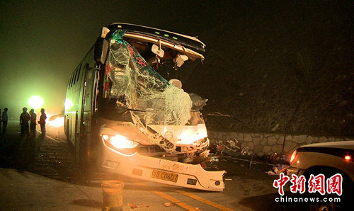 5月24日凌晨零点40分, 在国道050线广西河池市金城江区保平乡境内发生一起重特大交通事故,一辆从南宁往金城江方向(车牌号为桂MA3308)的大客车与一辆从金城江往南宁方向(车牌号为粤BC0607)的大客车发生碰撞。据初步统计,目前事故已造成10人当场死亡,1人送医院抢救无效死亡,36人受伤(其中重伤2人)。中新社发 蒋雪林 摄