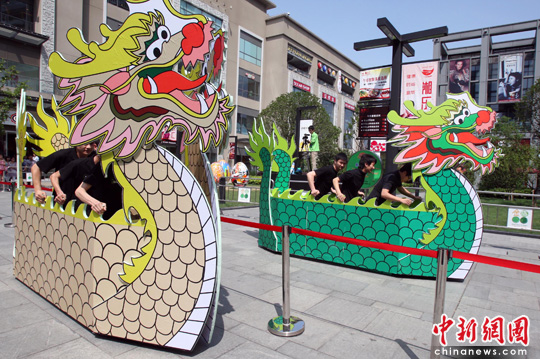 赛龙舟是端午节的一项重要活动。6月16日,在上海金桥国际广场举行的一场别出心裁的旱地龙舟赛吸引了众多路人的目光。不少家长带着孩子来参加旱地龙舟赛,感受端午文化的魅力。中新社发 汤彦俊 摄