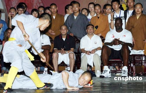 7月13日,NBA球星“大鲨鱼”奥尼尔一行造访了河南少林寺,并在少林寺练功房内欣赏武僧们的功夫表演。中新社发 王中举 摄