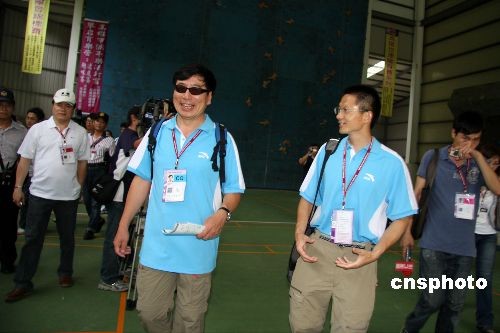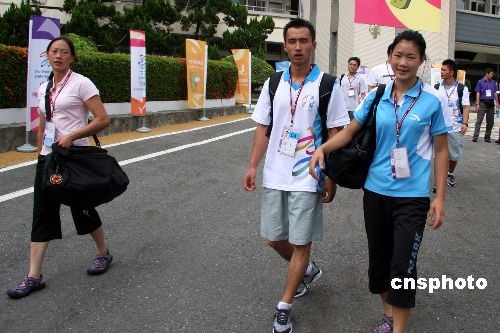 7月17日下午,参加第八届世界运动会的中国攀岩代表队的4名攀岩好手来到高雄寿山中学,因比赛场地不向选手开放,未能进行“暖身”,但他(她)们的夺金信心不减。中新社发 董会峰 摄