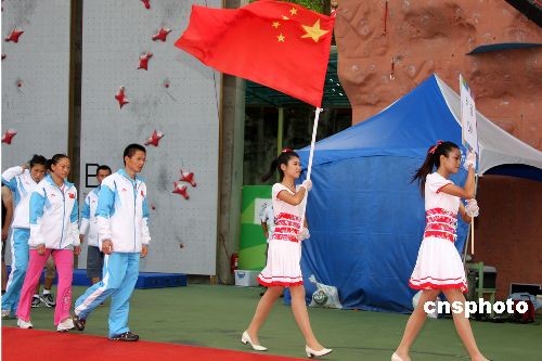 7月18日下午,中国攀岩“梦之队”现身高雄市寿山中学,参加第8届世运会攀岩竞速项目比赛。图为教练丁祥华率四名运动员入场,当晚将冲击中国队首枚金牌。中新社发 董会峰 摄