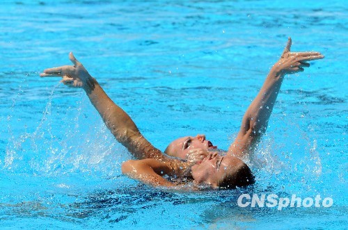 罗马时间7月24日上午,罗马游泳世锦赛举行花游双人自由自选项目决赛,俄罗斯选手最后夺得金牌。中新社发 廖攀 摄