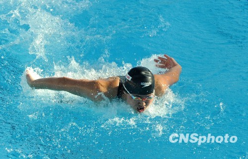 罗马时间7月27日傍晚,中国选手焦刘洋在罗马游泳世锦赛游泳女子100米蝶泳决赛中,以56秒86获得铜牌。图为焦刘洋在比赛中。中新社发 廖攀 摄