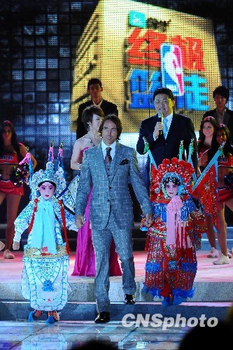 8月28日晚间,美国NBA篮球菲尼克斯太阳队主力控球后卫史蒂夫・纳什携两名京剧装束的中国儿童登台,参加在北京举行的“NBA终极篮徒”活动的颁奖仪式。中新社发 侯宇 摄