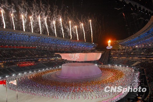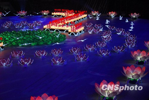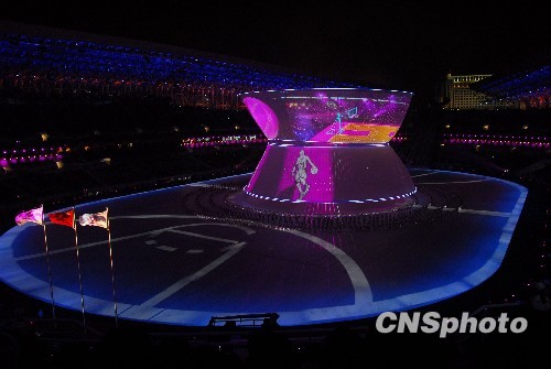 2009年10月14日晚8时,第十一届全国运动会开幕式预演在济南奥体中心“西柳”体育场举行。整台晚会大气磅礴、气势宏伟,精彩纷呈,表达了山东儿女对十一运会的热切期盼与祝福。 中新社发 史奎华 摄