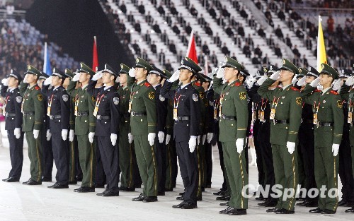 10月16日,第十一届全运会在山东济南开幕,由武警和公安组成的前卫体协代表团入场时面向主席台敬礼。中新社发 张宇 摄