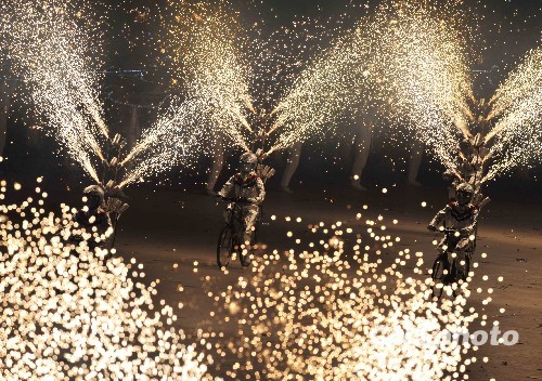 10月16日晚,扮作金属人的铁骑士喷着焰火,在中国第十一届全运会济南开幕式团体操上展现山东新特色。中新社发 贾国荣 摄
