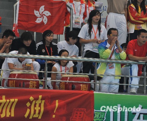 10月18日,十一届全运会男子4X100米自由泳接力赛预赛在济南举行,图为香港啦啦队在游泳赛场为参赛的香港运动员加油。中新社发 贾国荣 摄