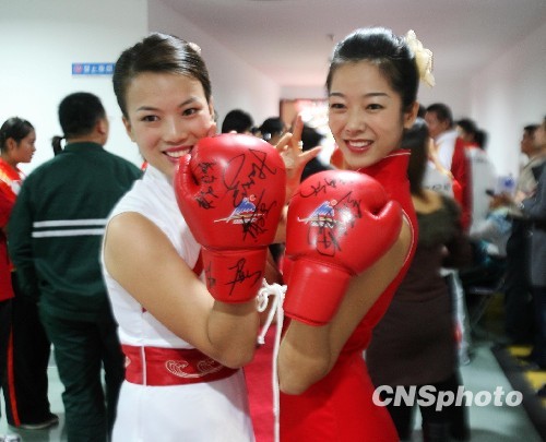 10月17日晚,第十一届全运会散打比赛在山东菏泽举行,负责颁奖的礼仪小姐拿着武术散打运动员的拳击手套爱不释手。中新社发 王中举 摄