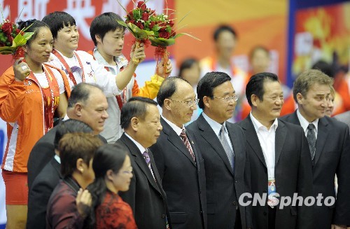 10月18日下午,中国国家体育总局局长刘鹏在济南皇亭体育馆出席全运会58公斤级举重颁奖礼。河南选手李雪英在第十一届全运会女子58公斤级抓举、挺举赛中,以总成绩第一夺得冠军。中新社发 陈文 摄