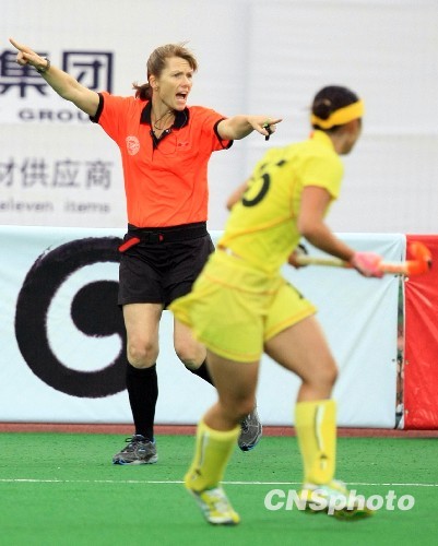 10月18日,在全运会女子曲棍球决赛中,来自澳大利亚的金发女裁判Lynn Cowie McALister吸引了众多球迷的“眼球”。据悉,本届全运会共请来近60名外籍裁判,保证比赛执法公正公平。中新社发 汤彦俊 摄
