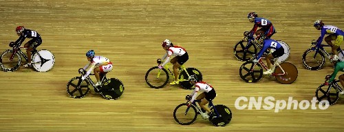 10月19日,第十一届全运会自行车比赛在山东省体育局训练中心自行车馆继续进行。图为女子计分赛中运动员比赛中的身影宛如音符。中新社发 刘震 摄