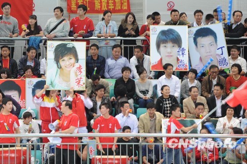 10月19日晚,在第一届全运会游泳项目的赛场,有“粉丝”观众亮出特意放大的运动员照片,为参赛选手加油助威。中新社发 王中举 摄