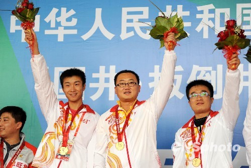 2009年10月20日,全运会射击比赛。在当日结束的男子10米气手枪比赛中,内蒙古队以1749环的总成绩获得冠军,辽宁队和安徽分获2、3名。中新社发 张侃 摄