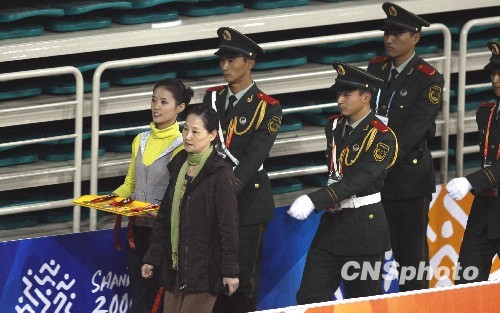 10月20日,第十一届全运会柔道比赛在山东滨州举行,图为武警护送奖牌进场。中新社发 张宇 摄