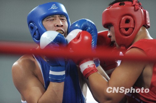 10月20日晚,解放军拳击手尼加提.玉山(红)在第十一届全运会拳击91公斤级比赛中,以超实力战胜河北选手乔海报进入下一轮比赛。中新社发 陈文 摄