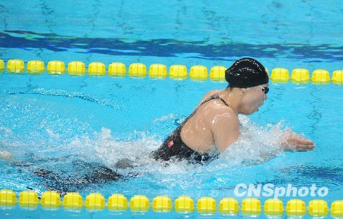 10月22日,全运会游泳女子200米蛙泳比赛中,解放军队选手齐晖以2分21秒37的成绩获得冠军,并创造了新的亚洲纪录。上海队选手季丽萍和山西队选手赵瑾分别获得2、3名。中新社发 张侃 摄