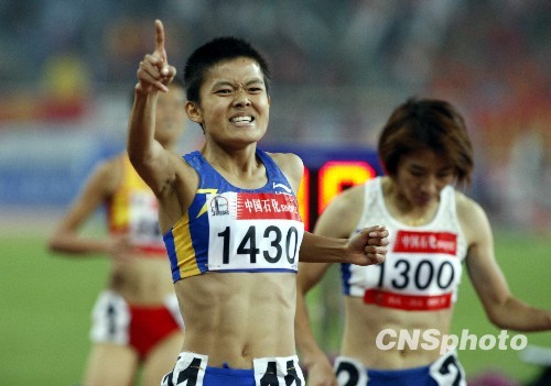 10月23日,第十一届全运会田径比赛进行女子1500米决赛,来自江苏的薛飞夺冠。薛飞已在女子5000米比赛中夺冠,成为本届全运会中长跑双冠王。中新社发 张宇 摄