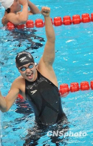 14岁的辽宁李哲思10月24日晚在济南11届全运会女子50米自由泳决赛夺得冠军,挥拳证明自己最棒。中新社发 贾国荣 摄