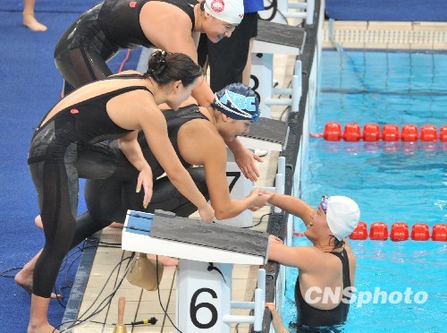 由北京奥运冠军刘子歌领衔的上海队,10月24日晚在济南11届全运会女子4x100米混合泳接力决赛上,以3分54秒99的成绩问鼎冠军后,全队欢聚泳池边。中新社发 贾国荣 摄