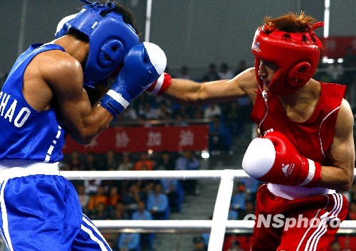 10月26日,十一届全运会拳击比赛在山东交通学院体育馆举行,最引人瞩目的48KG级别决赛中,北京奥运会冠军贵州选手冠军邹市明(红)以24:3轻松战胜了广东选手黎家赵(蓝)。中新社发 刘震 摄