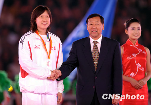 10月28日晚,泳坛名将刘子歌在济南出席第十一届全运会闭幕式颁奖礼。刘子歌获得女子一百米蝶泳、二百米蝶泳、四乘一百米混合泳接力三枚金牌。在女子二百米蝶泳中,其二分零一秒八一的成绩超过世界纪录,这是本届全运会上唯一可能改写世界纪录的成绩。 中新社发 陈文 摄