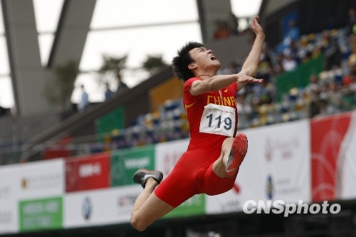 12月10日,2009东亚运动会继续在香港进行激烈的争夺,中国选手李金哲夺得男子跳远决赛冠军。图为李金哲在比赛中。中新社发 盛佳鹏 摄
