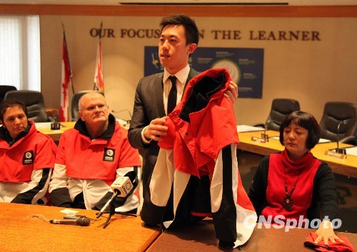 在温哥华列治文教育局10日举行新闻发布会上,华人服装设计师林澍展示了为冬奥会开幕式部分演出设计的演出服装。林澍说,他的设计突出了加拿大国家的重要元素。林澍说,他设计的重点在服装背后的抽象的枫叶,这是加拿大国家的象征;其次,这枫叶像火焰,代表了圣火,也代表体育精神;第三,这枫叶像鹿角,这也是加拿大颇受宠爱的动物。中新社发 赖海隆 摄