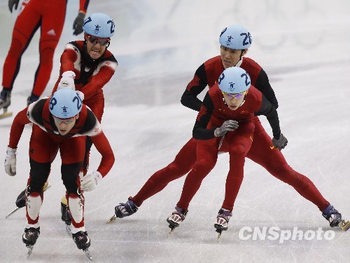 当地时间2月17日,温哥华冬奥会短道速滑男子5000米接力比赛在太平洋体育馆举行,中国队(右)最后时刻战胜东道主加拿大队,以小组头名跻身接力决赛。中国队派出韩佳良、刘显伟、马云峰和宋伟龙出战,同组对手有加拿大队、德国队和英国队。中新社发 盛佳鹏 摄