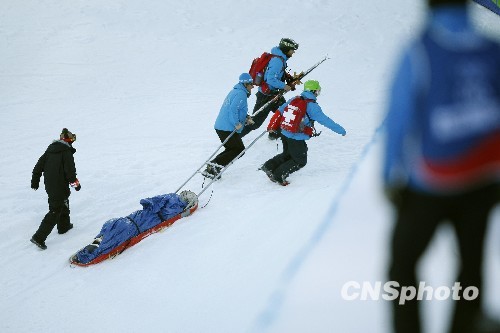 当地时间2月18日,2010年温哥华冬奥会单板滑雪女子U型池决赛在温哥华塞普里斯山滑雪场落下帷幕。一名在比赛中受伤的运动员被医疗人员用“雪橇”运出赛场接受治疗。中新社发 盛佳鹏 摄