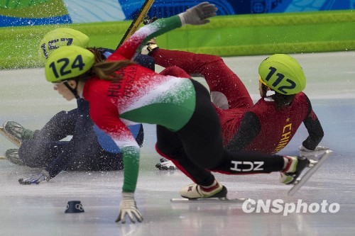 当地时间2月20日,2010年温哥华冬奥会短道速女子1500米的比赛在温哥华太平洋体育馆进行,中国选手王濛(右一)在半决赛中失误摔倒,无缘决赛。中新社发 盛佳鹏 摄