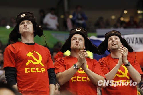 当地时间2月21日,2010年温哥华冬奥会男子冰球进入第6天的争夺,在小组赛中,B组的俄罗斯队和捷克队相遇,俄罗斯4:2战胜捷克队。图为球迷穿戴着有前苏联元素的衣帽观看比赛。中新社发 盛佳鹏 摄