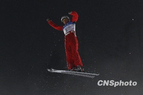 当地时间2月25日,2010年温哥华冬奥会自由式滑雪男子空中技巧决赛在温哥华塞普里斯山滑雪场进行,中国选手贾宗洋获得第6名。中新社发 盛佳鹏 摄