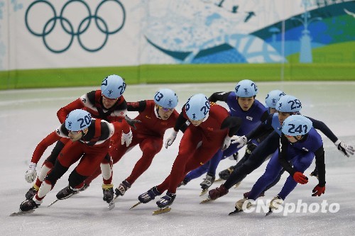 当地时间2月26日,2010年温哥华冬奥会短道速滑男子5000米接力比赛在温哥华太平洋体育馆结束,中国队在比赛中名列第四,无缘奖牌。中新社发 盛佳鹏 摄