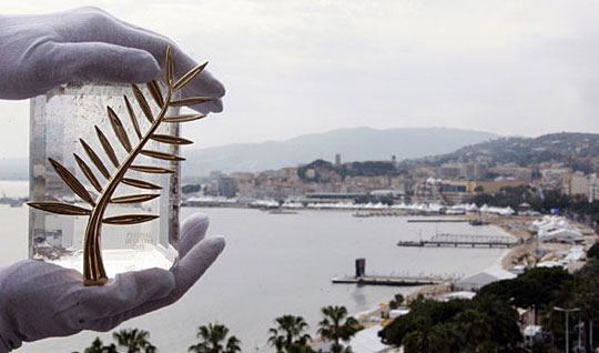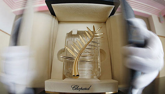 5月12日,在法国戛纳,一名工作人员展示由24K黄金打造的戛纳电影节金棕榈奖奖品——一片金棕榈叶。第62届戛纳国际电影节将于5月13日至24日在法国南部海滨城市戛纳举行。