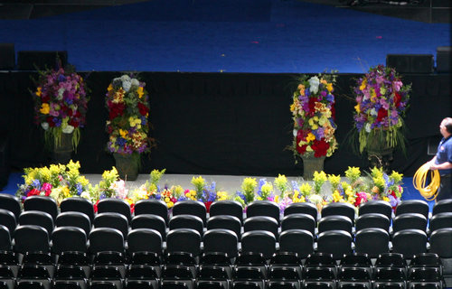 当地时间7月7日,工人现身斯台普斯体育中心(Staples Center)内场,为杰克逊的公众悼念活动进行最后的准备工作。只见体育馆内座位呈一袭黑色,庄重肃穆,而舞台上则摆满了各色鲜花,似乎是希望杰克逊能在花香中一路走好。