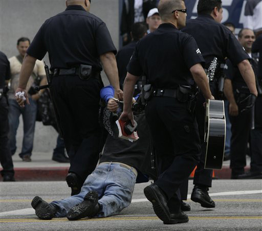 北京时间7月8日凌晨,迈克尔·杰克逊的公众追思会在美国洛杉矶的斯台普斯体育中心举行。图为一名歌迷于公共悼念仪式现场外被逮捕。