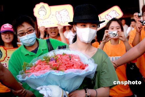 2009年7月11日,钟欣桐(阿娇)到达哈尔滨,晚7点多从机场出来,她戴着防流感口罩,上身穿绿色短袖长衫,头带黑亚麻粗编礼帽走出机场。现场粉丝很多,阿娇随走随接受粉丝们的礼物和鲜花。阿娇将于7月12日在哈尔滨冰雪大世界园区嘉年华现场与观众见面。中新社发 姚庭山 摄