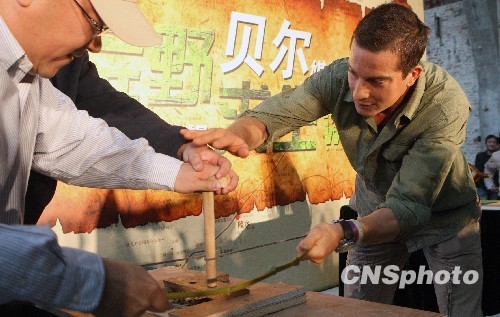 10月15日,作为全球发行最广的电视品牌之一,Discovery探索频道在北京宣布,热播系列专辑《荒野求生》的“中国特辑”已顺利完成拍摄。节目主持人兼探险家贝尔·吉罗斯(Bear Grylls)出席了在北京举办的新闻发布会,《荒野求生:中国特辑》(MAN VS WILD: CHINA)计划将于明年初在中国各地电视台的《探索》栏目以及全球各地的Discovery探索频道首映播出。图为贝尔·吉罗斯亮相《荒野求生:中国特辑》发布会在现场与嘉宾互动。中新社发 钱兴强 摄