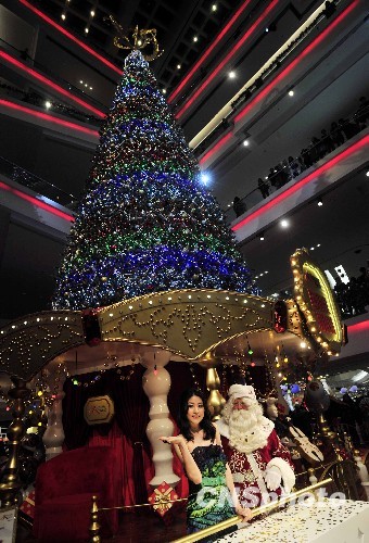十一月二十四日晚,艺人陈慧琳为香港又一城商场,主持高达二十一米巨型圣诞树亮灯仪式。圣诞节临近,香港不少商场已推出圣诞宣传,期望年底前最后一个黄金档期催谷生意。中新社发 谭达明 摄